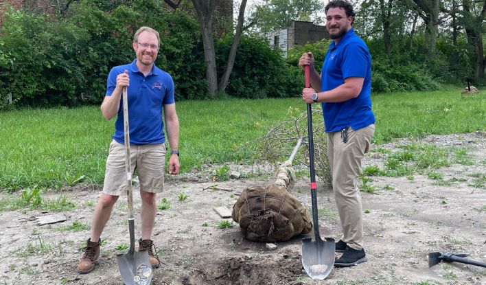 Next up? A very memorable component of building this Community Garden, the selection, placement, and heavy labor involved in planting trees! We had help from our landscaper in building the perennial beds, along with guidance, sweat labor, and loving hands of Bridget Morin, mother of Co-Founders Matt & Kevin Morin. The perennials we ordered from Allemon’s Landscaping, and the trees came to us from the Greening of Detroit.